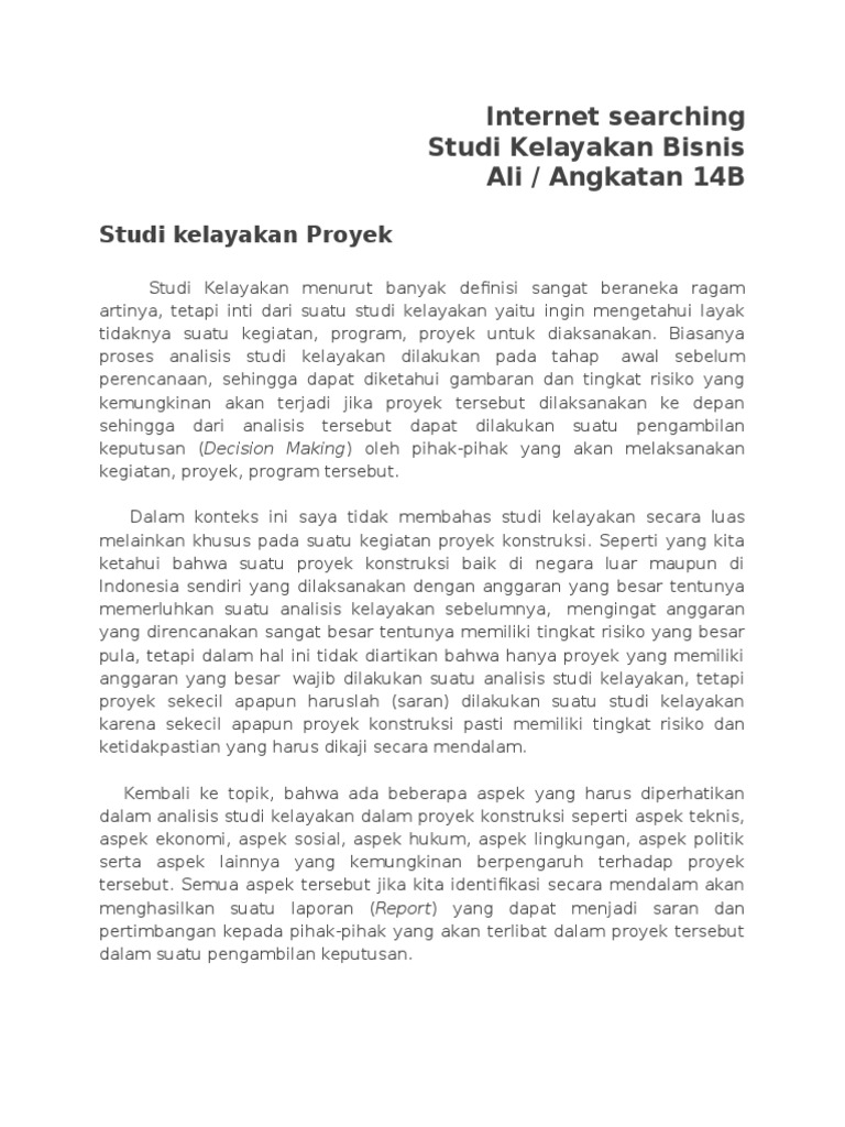 Tania afifah 0174000024 jurusan akutansi s1 sekolah tinggi ilmu ekonomi stie kusuma negara 2020 kata pengantar assalamualaikum wr. Di bawah ini akan dibahas lebih lanjut mengenai hal tersebut. Suatu kegiatan yang mempelajari secara mendalam tentang suatu kegiatan atau usaha yang akan dijalankan untuk menentukan layak atau tidaknya suatu bisnis dijalankantujuan utama dilakukan studi kelaykan bisnis ini tentunya yang akan berdiri bisa berjalan sesuai harapan baik dalam jangka pendek atau panjang.