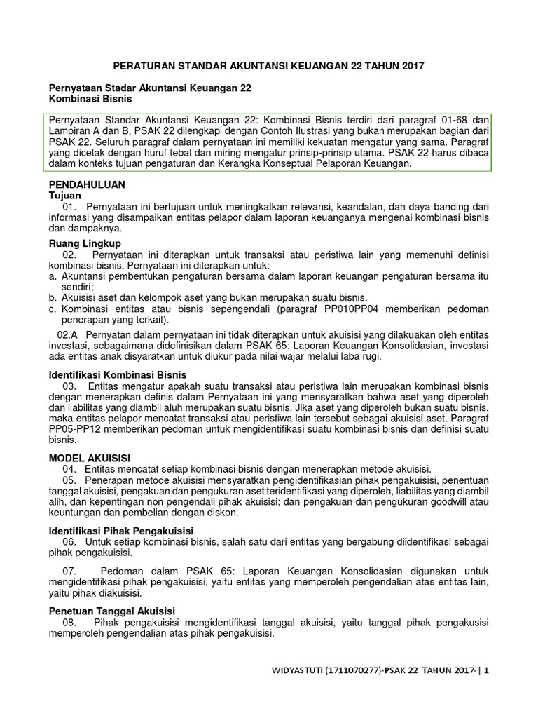 22 revisi 2010 pengantar dewan standar akuntansi keuangan telah menyetujui exposure draft psak 22 revisi 2010 tentang kombinasi bisnis dalam rapatnya pada tanggal 12 january 2010 untuk disebarluaskan dan ditanggapi oleh kalangan anggota iai dewan konsultatif sak dewan pengurus. Psak 22 tentang kombinasi bisnis telah disahkan oleh dewan standar akuntansi keuangan pada tanggal 12 januari 2010. Telah menyetujui draf eskposur de psak 22 penyesuaian 2018.