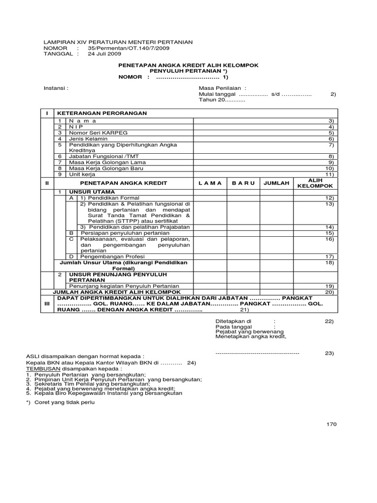 Angka kredit adalah satuan nilai dari tiap butir kegiatan dan atau akumulasi nilai butir butir kegiatan yang harus dicapai oleh pejabat fungsional penyuluh pertanian dalam rangka pembinaan karier yang bersangkutan. Tidak pernah mendapat hukuman disiplin pns. Bab i ketentuan umum.