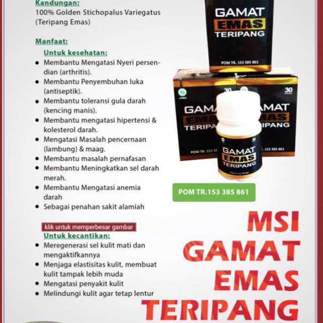 Gamat emas teripang msi. Teripang emas merupakan hewan laut invertebrate tidak bertulang belakang yang memiliki kasiat untuk membantu mengobati. Msi gamalife gold suplemen herbal tradisional dari ptmsi yang diproduksi dari ekstrak murni teripang emas laut timun laut emas. Msi gamat terbuat dari 100 stichopus hermanii teripang emas yang memiliki manfaat sangat baik sebagai obat herbal untuk menjaga kesehatan tubuh.