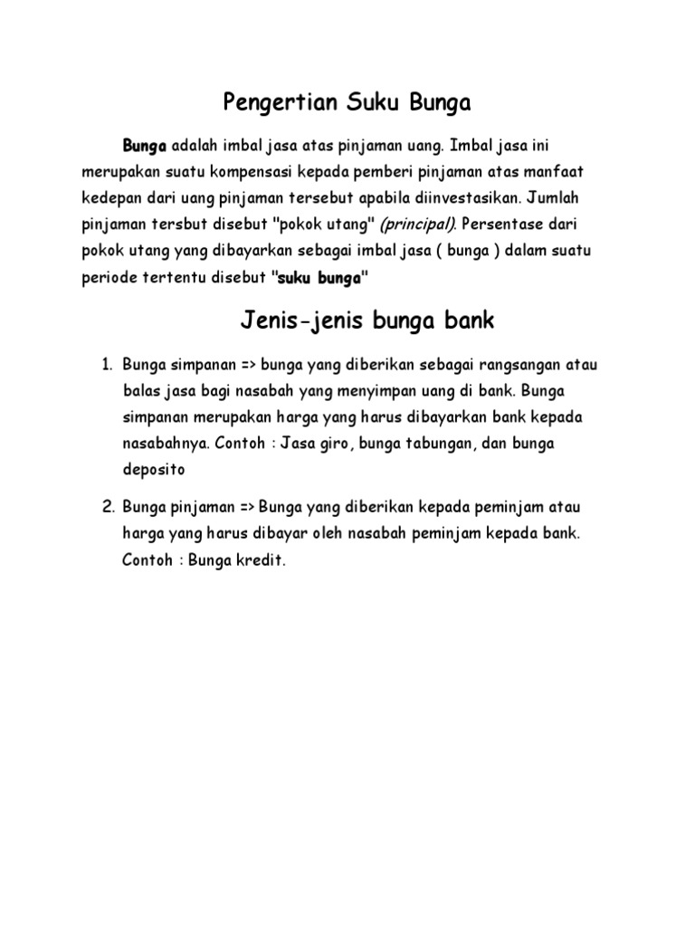 Tingkat suku bunga ini tidak berubah dari awal kesepakatan dibuat. Menurut ramirez dan khan 1999 7. Suku bunga pengertian jenis jenis serta contoh bunga pada dasarnya merupakan balas jasa yang diberikan oleh pihak bank kepada nasabahnya atau oleh pihak yang membutuhkan uang kepada pihak yang memerlukan uang tersebut.