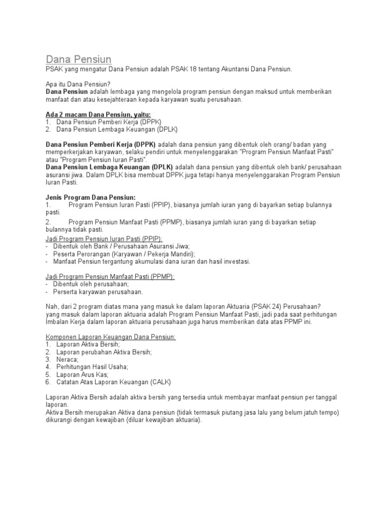 Ada dua jenis pembayaran uang pensiunan yang biasa dilakukan oleh perusahaan baik untuk program pensiun manfaat pasti ppmp maupun program pensiun iuran pasti ppip. Dana pensiun lembaga keuangan dplk yang didirikan bank atau perusahaan asuransi jiwa bagi masyarakat umum baik karyawan maupun pekerja mandiri. Dana pensiun pemberi kerja dppk merupakan lembaga atau organisasi penyelenggara program pensiun manfaat pasti atau program pensiun iuran pasti yang dibentuk oleh perseorangan atau badan yang mempekerjakan karyawan atau selaku pendiri bagi kepentingan sebagian atau seluruh karyawan sebagai peserta dan menimbulkan kewajiban terhadap pemberi kerja.
