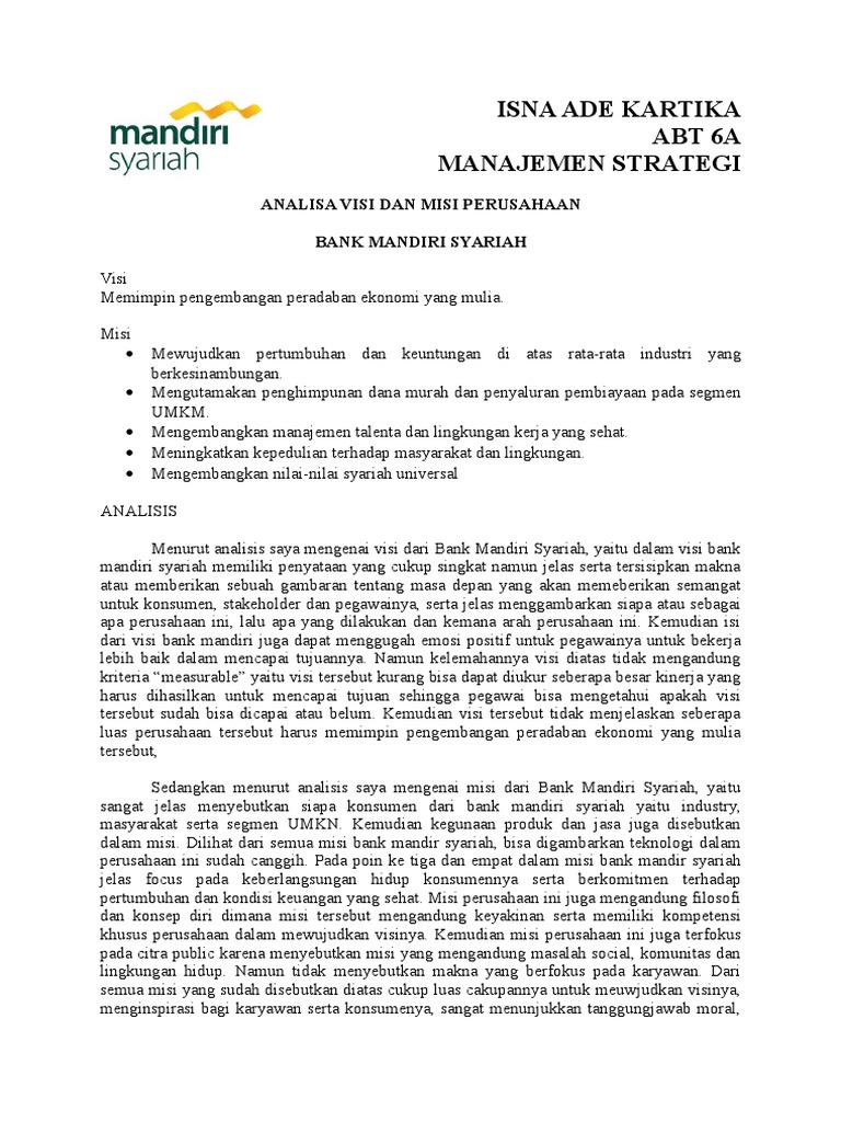Analisis Manajemen Strategi Mandiri Syariah Isna Ade Kartika