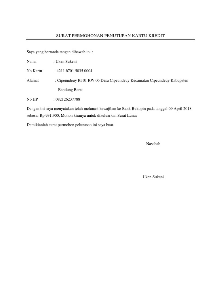 Admin blog berbagi contoh surat 2019 juga mengumpulkan gambar gambar lainnya terkait contoh surat permohonan penutupan kartu kredit dibawah ini. Contoh surat pernyataan penutupan kartu kredit kumpulan. Surat permohonan penutupan rekening bank perusahaan setiap perusahaan memiliki satu atau lebih rekening bank sebagai tempat menyimpan dana atau keuangan perusahaan.