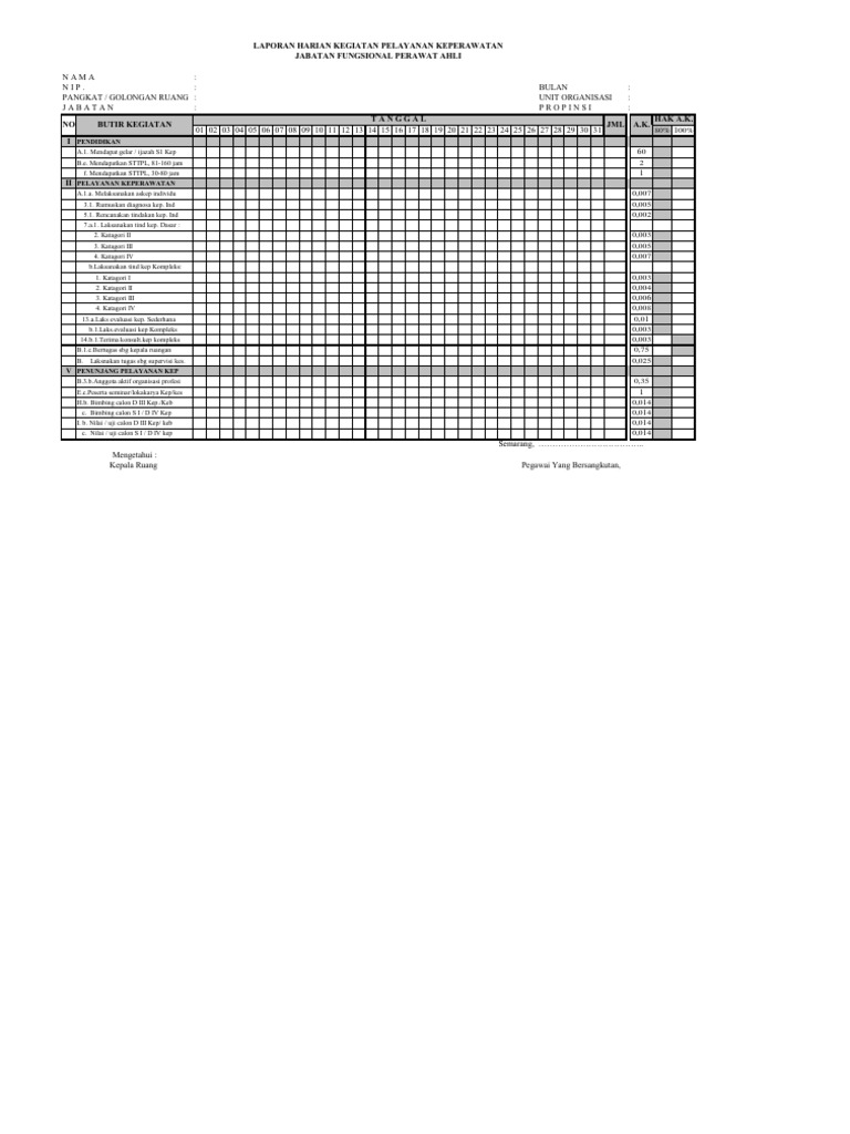 Setelah sekian lama angka kredit perawat mengalami perubahan dengan diterbitkannya permenpan no 25 tahun 2014 tentang jabatan fungsional perawat dan angka kreditnya. Penata muda iiia hingga penata muda tkt i iiib. Laporan harian kegiatan pelayanan keperawatan jabatan fungsional perawat ahli nama nip.