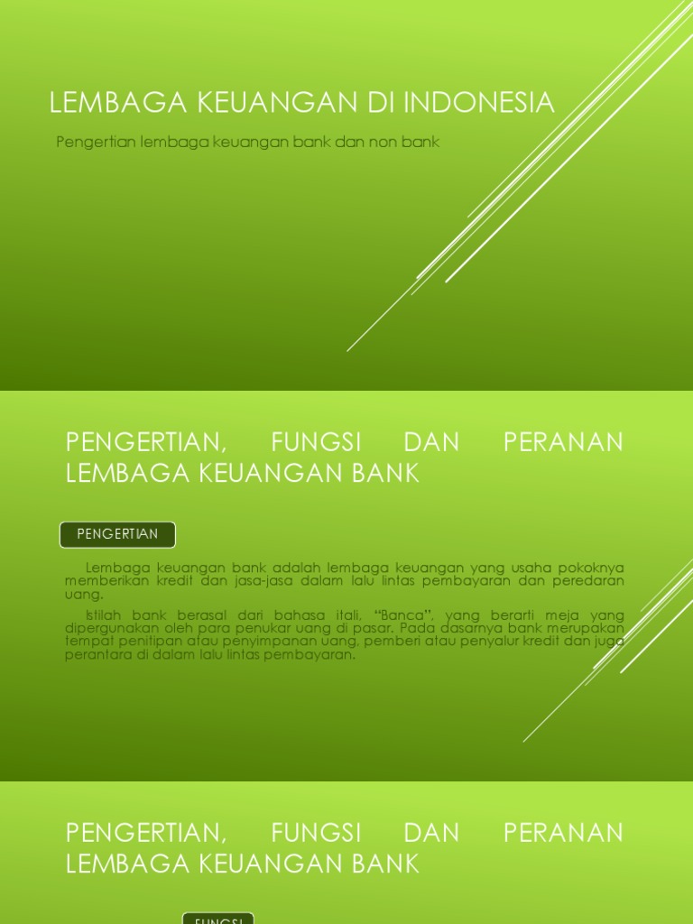 Materi lembaga keuangan bank. Pengertian lembaga keuangan bank adalah suatu badan usaha yang bergerak di bidang keuangan dimana kegiatannya menghimpun dana dari masyarakat secara langsung dan memberikan berbagai jasa keuangan kepada masyarakat luas. Keputusan menteri keuangan republik indonesia no.