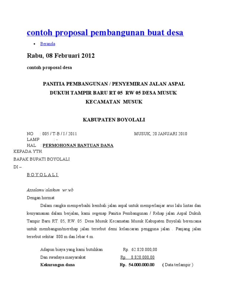 Contoh proposal bantuan dana pembangunan jalan. Berdasarkan rapat pengurus rt 04 pada tanggal 25 juli 2012 kami memutuskan untuk mengadakan pembangunan dan pengerasan jalan cor blok di wilayah rt 04. Pemerintah kabupaten kebumen kecamatan adimulyo desa tanbaharjo. Permohonan bantuan perbaikan jalan tonjong kaler sindangraja november 2010 kepada yth.