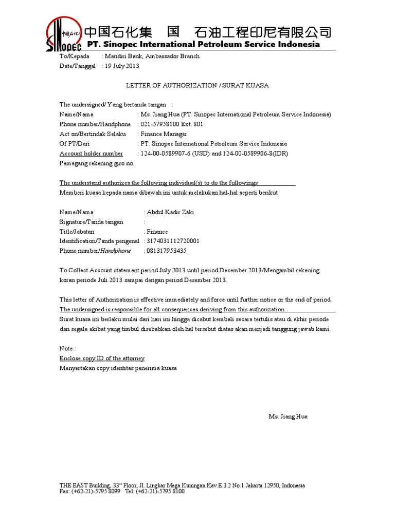Setiap perubahan penguruspemberi kuasa maupun penerima kuasa akan diberitahukan kepada bank mandiri dan selama pemberitahuan tersebut belum diterima maka setiap transaksi yang dilakukan berdasarkan letter of authorization ini sah dan mengikatdiisi nama perusahaanyayasan. Gf dan 3 jljendsudirman kav52 53 jakarta 12190 indonesia. Type your authorization letter rather than writing it by hand.