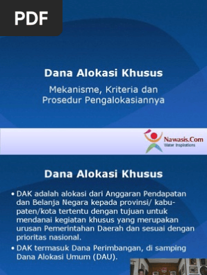 Dana alokasi khusus dak adalah alokasi dari anggaran pendapatan dan belanja negara kepada provinsikabupatenkota tertentu dengan tujuan untuk mendanai kegiatan khusus yang merupakan urusan pemerintahan daerah dan sesuai dengan prioritas nasional. Dana alokasi khusus bertujuan untuk mendanai kebutuhan kebutuhan daerah yang bersifat khusus. Dana alokasi khusus adalah alokasi dari anggaran pendapatan dan belanja negara kepada daerah tertentu dengan tujuan untuk mendanai kegiatan khusus yang merupakan urusan pemerintahan daerah dan sesuai dengan prioritas nasional.