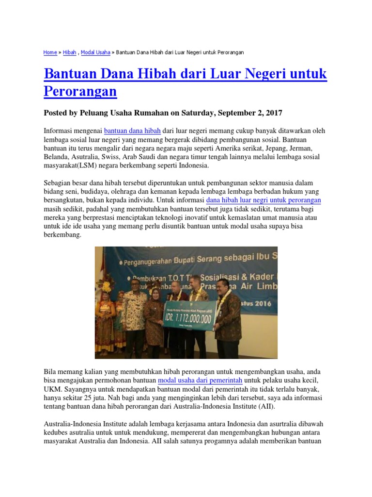 Dana hibah atau cuma cuma ini di peruntukkan bagi yayasanpesantren organisasi sosial ataupun semua kegiatan yang berorientasi sosial atau untuk kemaslahatan orang banyak dimana ada sebuah lembaga donor dari luar negeri yang bersedia menyisihkan keuntungan dari beberapa perusahaan pendonor mereka untuk di sumbangkan kepada organisasi atau yayasan yang memerlukan bantuan dana. Hal hal yang perlu diperhatikan dalam penggunaan bantuan luar negeri. Bisa saja kamu mendapatkan dana hibah yang tak terbayangkan sebelumnya.
