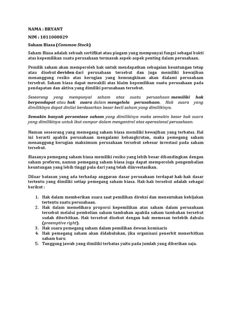 Termasuk jenis jenisnya dan juga perbedaan perbedaan dari setiap jenis yang ada. Pemegang saham biasa tidak memiliki hak hak istimewa untuk menentukan kebijakan seperti pada saham preferen. Ya pemegang saham biasa memiliki hak suara yang lebih diutamakan terutama dalam pemilihan jajaran manajemen mulai dari dewan komisaris direksi dan seterusnya.