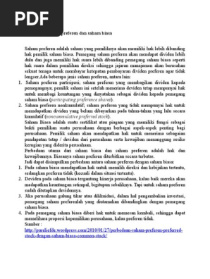 Perbedaan saham biasa dengan saham preferen surat surat berharga yang diperdagangkan di pasar modal sering disebut efek atau sekuritas salah satunya yaitu saham. Hak suara saham preferen tidak memiliki hak suara. Secara umum berikut beberapa hal yang dapat dilakukan oleh pemegang saham biasa dalam rups.