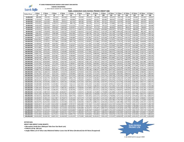Tabel angsuran pinjaman kur bank bjb hampir setiap bank bank yang ada di indonesia ini menawarkan layanan produk pinjaman kredit usaha rakyat atau kur. Tabel angsuran kta bank bjb terbaru januari 2021 oleh admin diposting pada 4 januari 2021 4 januari 2021 bank menjadi salah satu pilihan banyak orang untuk memenuhi kebutuhan dana mereka. Dari simulasi di atas dapat kita lihat khusus pengajuan di bawah rp 60 juta tenor pinjaman maksimum hanya 36 bulan.