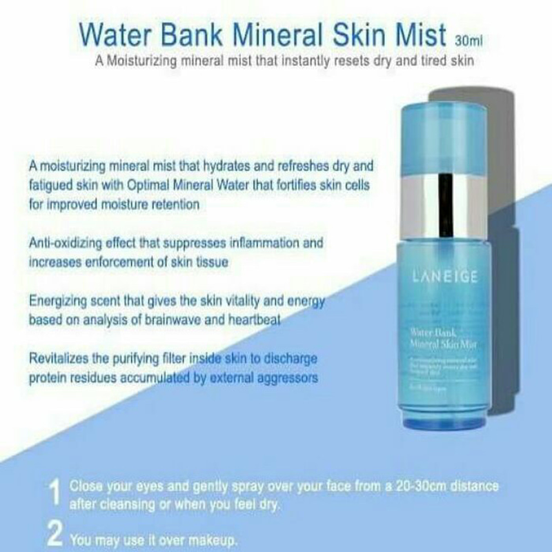 Semprotkan 3 4 kali setiap penggunaan suitable for. Jual laneige water bank mineral skin mist face spray dengan harga rp89900 dari toko online emuba shop kab. Laneige water bank mineral skin mist for all skin types 30ml brand.