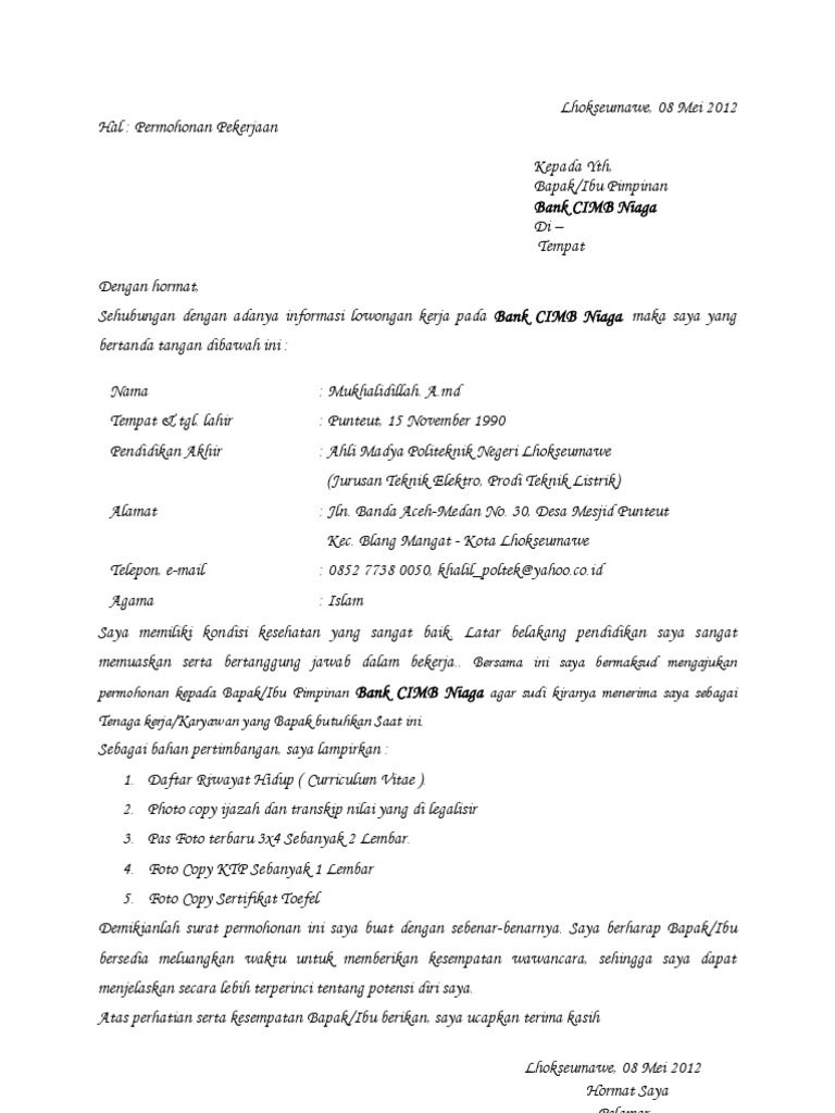 Contoh Surat Lamaran Untuk Bank Cimb Niaga
