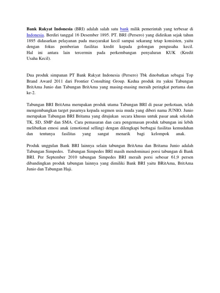 Produk unggulan bank bri ini dapat anda gunakan untuk melakukan transfer uang lewat atm bri dan mengambil uang langsung melalui atm bri apabila memang diperlukan. Tabungan bri simple tabungan untuk siswapelajar yang ditertibkan oleh bank bri dengan persyaratan mudah dan sederhana serta fitur yang menarik dalam ran. Pada awalnya bank rakyat indonesia bri didirikan di purwokerto jawa tengah oleh raden bei aria wirjaatmadja dengan nama de poerwokertosche hulp en spaarbank der inlandsche hoofden atau bank bantuan dan simpanan milik kaum priyayi purwokerto suatu lembaga keuangan yang melayani orang orang.