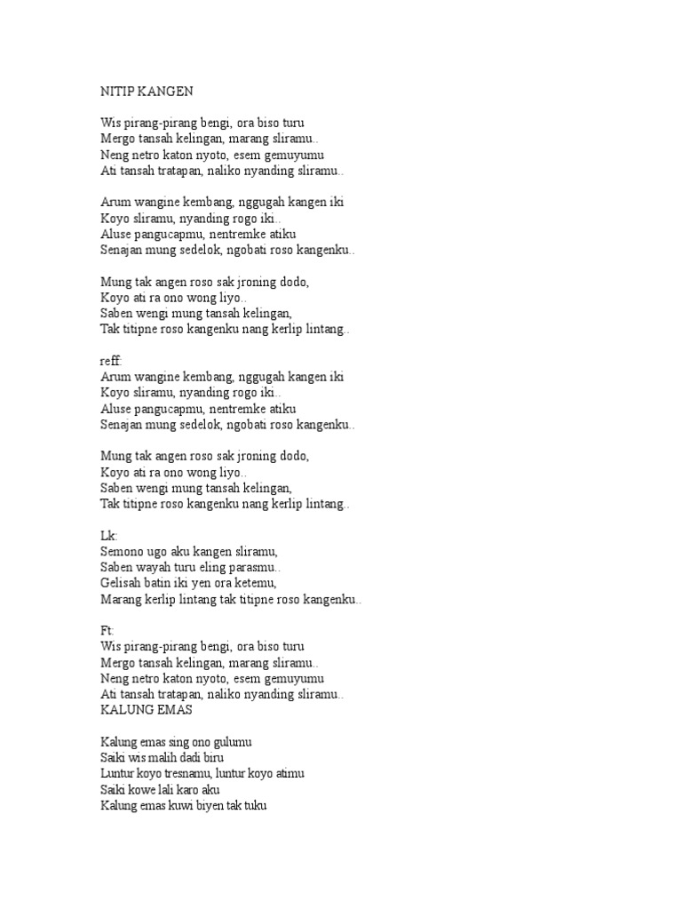 Lirik lagu kalung emas. Kalung emas kuwi biyen tak tuku tak pasrahke mung kanggo sliramu gede roso tresnoku yo mung kanggo sliramu ra nyono kowe lali karo aku. Kalung emas ku mbiyen tak tuku. Sebelumnya lagu ini pernah dibawakan oleh didi kempot.