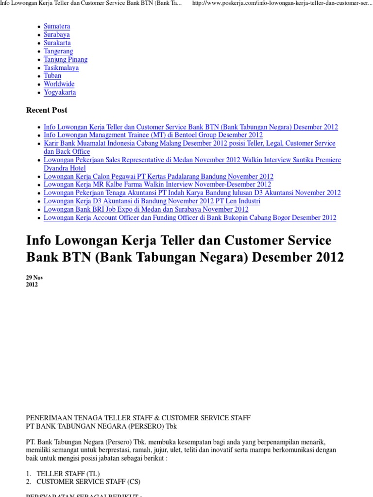 Lowongan Kerja Customer Service Staff Cs Bank Btn Tahun