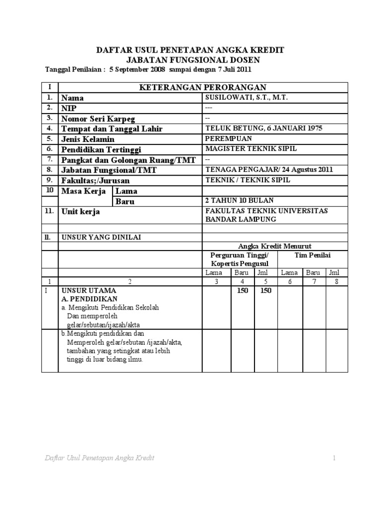 Daftar usul penetapan angka kredit. Aplikasi ini dibuat untuk mempermudah plp dalam pengisian formulir dupak atau usul penetapan angka kredit. Tanggal 1 juli 2006 sd 30 juni 2011. Nip nomor seri karpeg 196512311988031033 e614966 3.