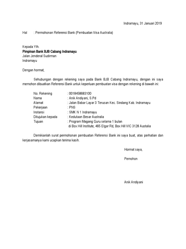 Surat Permohonan Referensi Bank Untuk Visa Kumpulan Contoh