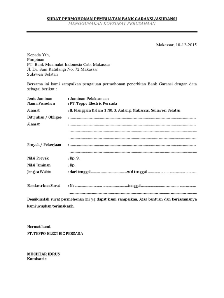 Surat permohonan bank garansi. Ok terima kasih yaa temen temen semoga artikel contoh surat permohonan garansi bank ini bisa membantu kamu dan saya minta tolong bagiin nih artikel siapa tau artikel contoh surat permohonan garansi bank ini bisa bermanfaat atau artikel yang sedang dicari temen kamu. Untuk lebih jelasnya mari simak pembahasannya secara lengkap di bawah ini. Jika benar anda bisa melihat contoh suratnya dibawah ini.