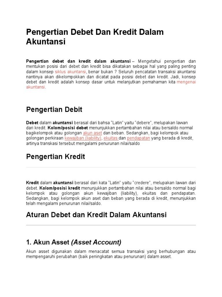 Pengertian debit kredit debit yaitu pencatatan akuntansi saat terjadi kondisi dimana aset dan biaya mengalamai peningkatan bertambah atau saat liability utang dan equity modal mengalami penurunan berkurang. Sedangkan debit adalah pengurangan deposito dalam rekening bank. Sehingga debit dan kredit tidak dapat dipisahkan satu sama lain.