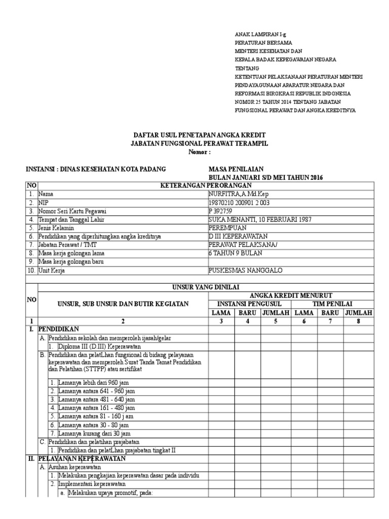 Angka kredit perawat ahlixls. Merupakan rekapitulasi kegiatan harian selama 6 bulan di dalam blanko tersebut sudah muncul isian angka kredit dengan mengalikan jumlah x bobot kreditbobot kredit untuk masing masing item berbeda antara perawat tergantung dari jabatan fungsional perawat disamping rekapitulasi laporan harian yang merupakan unsur utama ada item unsur penunjang yang tidak ada di laporan harian misalnya sudah.