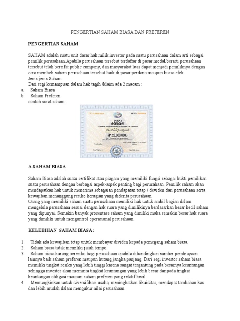 Pengertian saham biasa dan saham preferen. Dalam artikel ini akan dijelaskan lebih mendetail tentang pengertian saham preferen dan penjelasannya. Sedangkan saham preferen adalah jenis saham yang memiliki hak hak istimewa tambahan dari saham biasa. Ada perbedaan mendasar antara saham biasa common stock dengan saham preferen preferred stock.