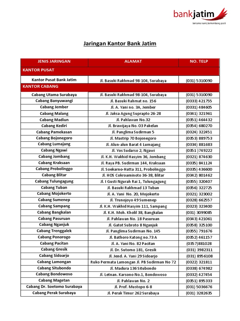 Surabaya 031 5310090 0315470159 7267526. Simpan simpan jaringan kantor bank jatim untuk nanti. 0 0 mendukung tandai dokumen ini sebagai bermanfaat 0 0 menolak tandai dokumen ini sebagai tidak bermanfaat tanamkan.