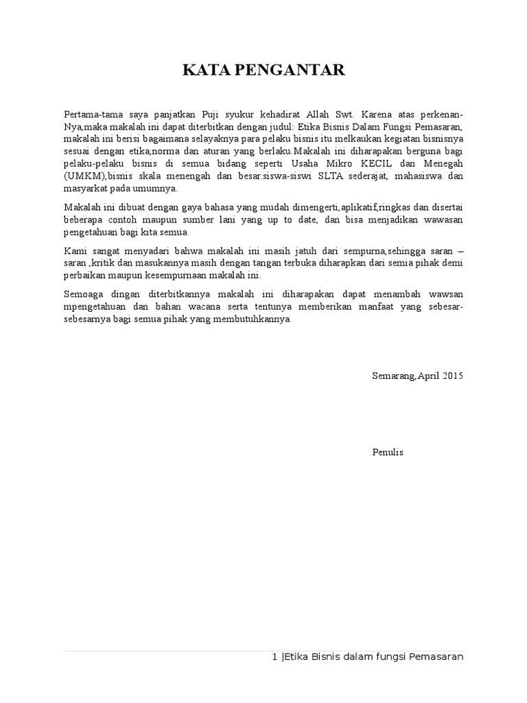 Kata pengantar makalah etika bisnis. Makalah pengantar bisnis etika bisnis dan tanggung jawab sosial kata pengantar puji dan syukur kami panjatkan kehadapan tuhan yme karena kesehatan dan ilmu pengetahuan yang ia berikan sehingga kami mampu menyelesaikan makalah ini tepat pada waktunya. Kata pengantar segala puji bagi allah swt yang telah melimpahkan rahmat dan nikmat yang tidak terhingga kepada kami selaku kelompok kami sehingga dapat menyelesaikan makalah etika bisnis dan profesi ini. Puji syukur kami panjatkan kehadirat tuhan yang maha esa karena dengan rahmat karunia serta taufik dan hidayah nya lah kami dapat menyelesaikan tugas makalah etika bisnis.