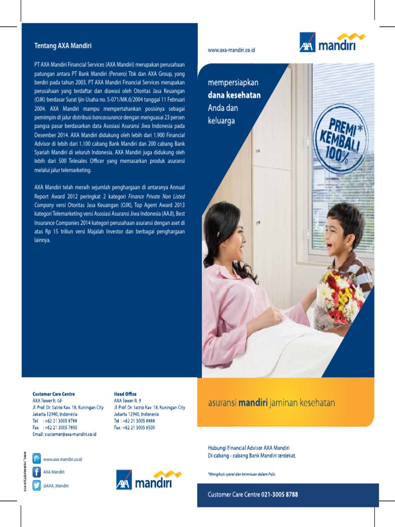 Kelebihan utamanya tentu menghemat waktu dan tenaga karena tanpa perlu keluar rumah pun kita sudah bisa memiliki polis asuransi kesehatan axa mandiri. Mandiri inhealth indemnity merupakan produk asuransi kesehatan kumpulan yang memberikan penggantian atas biaya pelayanan kesehatan yang terjadi dengan pilihan benefit atau plan yang disesuaikan dengan kebutuhan karyawan dan perusahaan anda serta kebebasan memilih cara memanfaatkan pelayanan. Mandiri jaminan kesehatan memberikan perlindungan pada saat harus menjalani perawatan medis di rumah sakit.
