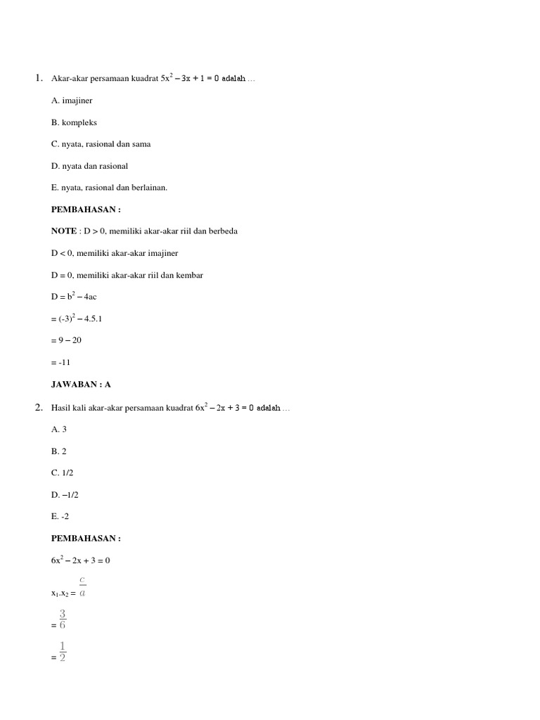 Contoh Soal Persamaan Kuadrat Pilihan Ganda Dan Jawaban