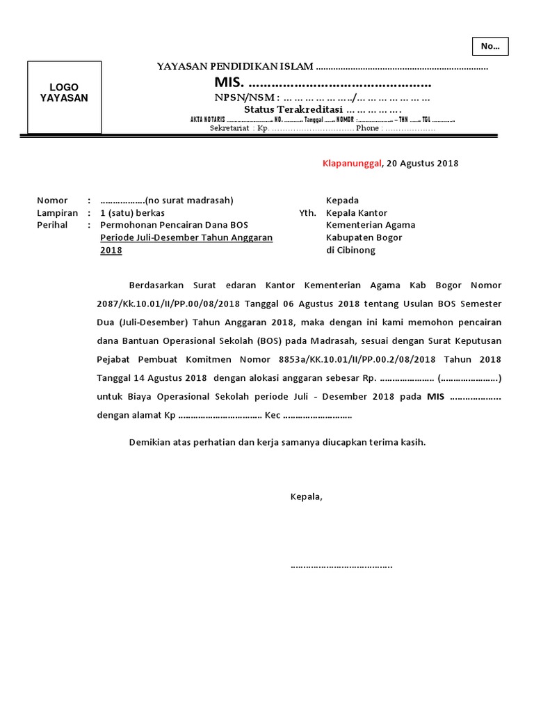 Contoh Surat Permohonan Pencairan Dana Bos Bantuan