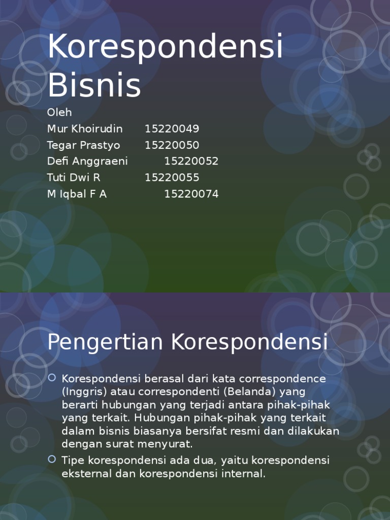 Korespondensi berasal dari kata correspondence inggris atau correspondenti belanda yang berarti hubungan yang terjadi antara pihak pihak yang terkait. Korespondensi berasal dari kata correspondence inggris atau correspondenti belanda yang berarti hubungan yang terjadi antara pihak pihak yang terkaithubungan pihak pihak yang terkait dalam bisnis biasanya bersifat resmi dan dilakukan dengan surat menyurat. Korespodensi bisnis merupakan suatu kegiatan korespondensi yang dilakukan dalam dunia bisnis baik dalam bentuk dalam surat memo agenda proposal maupun laporan bisnis.