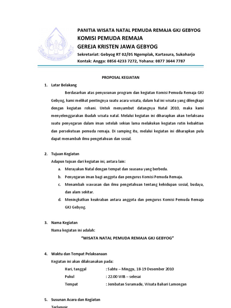Contoh proposal bantuan dana kegiatan gereja. Unsur yang perlu dicantumkan dalam pembuatan proposal tersebut antara lain surat pengantar dari pihak yang mengajukan judul proposal pendahuluan atau latar belakang maksud dan tujuan pelaksanaan kegiatan penutup dan lampiran lampiran. Yayasan rifaul jannah sunggingan nb. Itulah yang dapat admin bagikan mengenai contoh proposal bantuan dana pembangunan gereja.