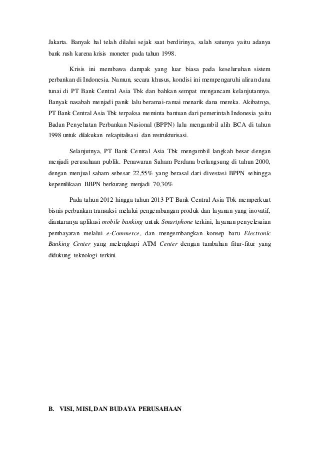 Visi misi dan riwayat singkat bca menjadi bank pilihan utama andalan masyarakat yang berperan sebagai pilar penting perekonomian indonesia visi dan misi bca ditetapkan untuk memberikan landasan arah dan panduan bagi segenap insan bca dalam menjalankan kegiatan usaha bca. Evaluasi atas visi dan misi bca dilakukan paling lama setiap 5 lima tahun sekali. Membangun institusi yang unggul di bidang penyelesaian pembayaran dan solusi keuangan bagi nasabah bisnis dan perseorangan.