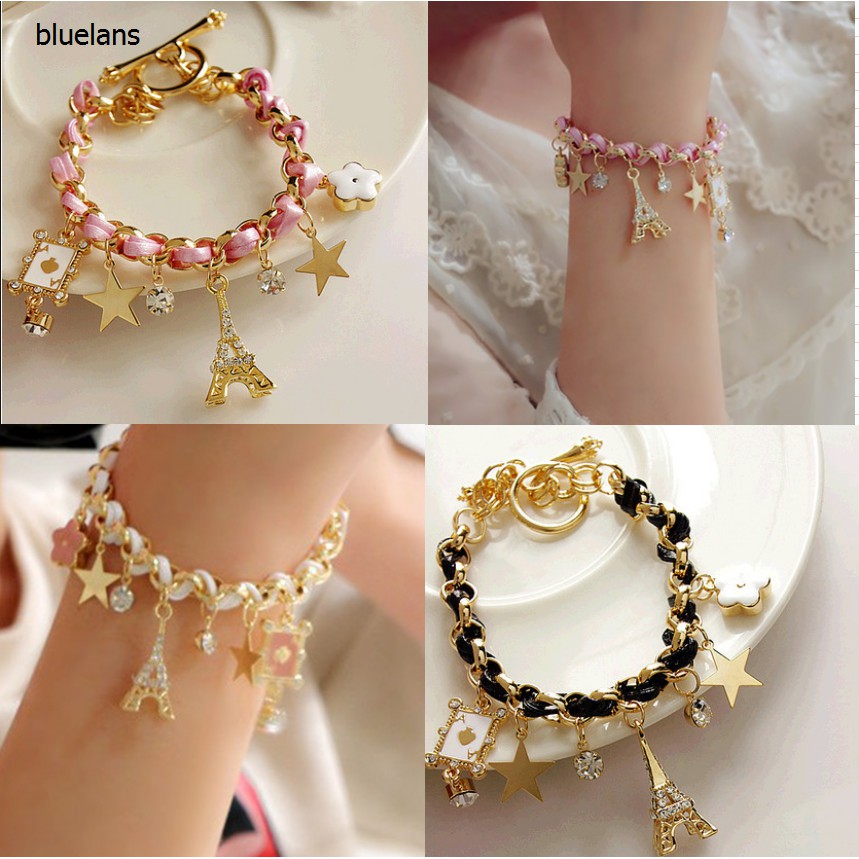 Gelang Fashion Bahan Kulit Model Kepang Warna Emas Dengan Hiasan Aneka Macam Bahan Kristal