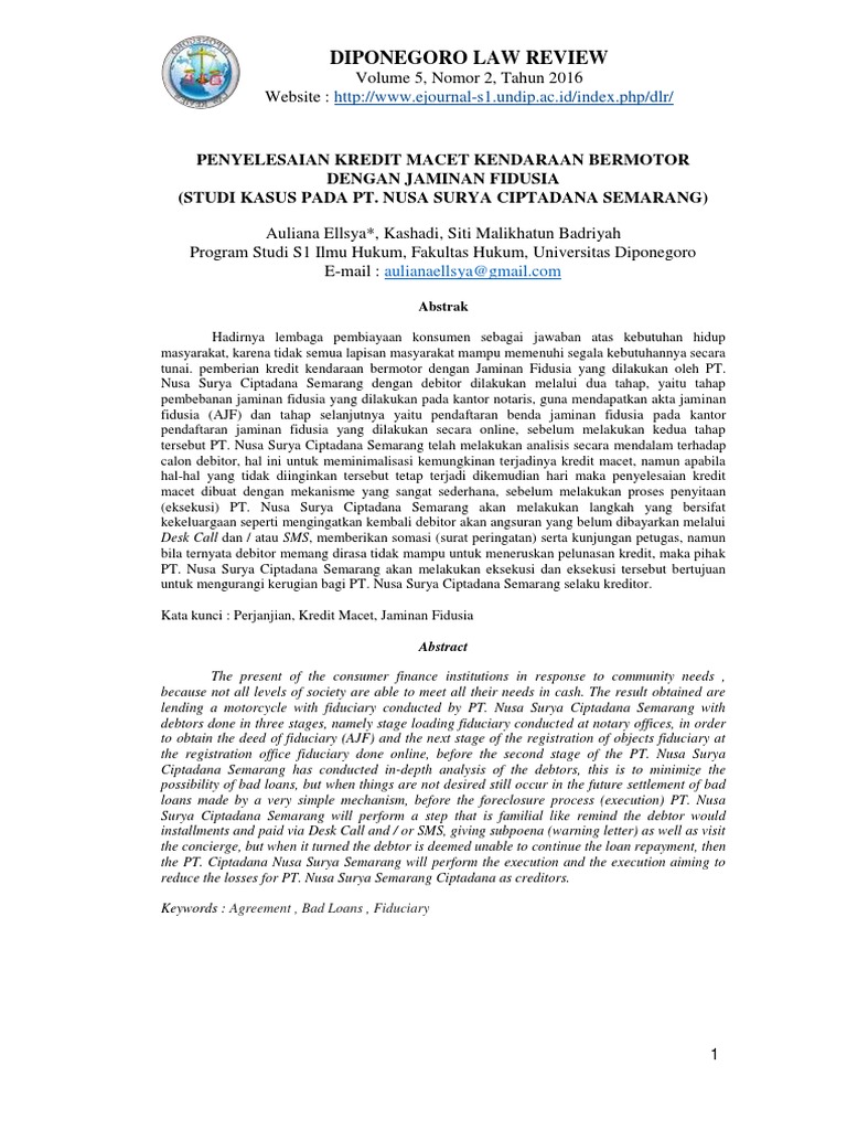 Eksekusi jaminan fidusia dalam penyelesaian kredit macet di perusahaan pembiayaan kendaraan sepeda motor pt. Mt hariyono no169 malang email. Abstrakpenelitian ini bertujuan untuk mengetahui dan meneliti permasalahanpermasalahan yang ada di bidang hukum jaminan khususnya mengenai cara eksekusi jaminan fidusia pada pt.