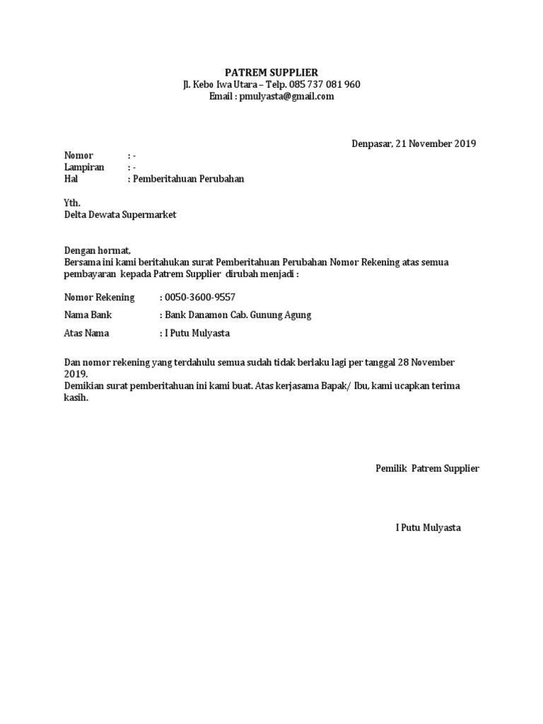 Contoh surat pemberitahuan perubahan nomor rekening bank perusahaan. Segar alam abadi dan nomor rekening yang terdahulu semua sudah tidak berlaku lagi per tanggal 25 oktober 2016. Contoh surat pemberitahuan perubahan nomor rekening bank contoh surat pemberitahuan perubahan nomor rekening bank perusahaandocx.
