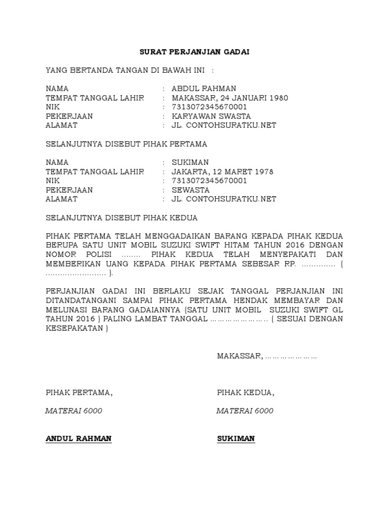 6 Contoh Surat Perjanjian Gadai Tanah Rumah Mobil Sawah
