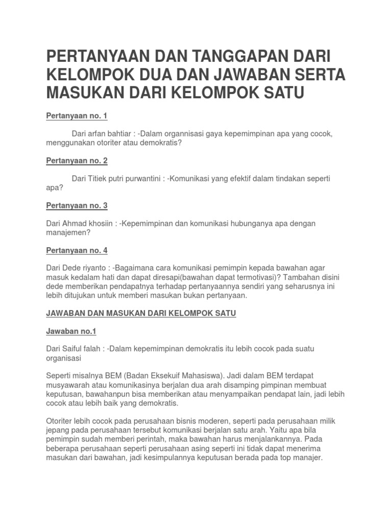 Pertanyaan Dan Tanggapan Dari Kelompok Dua Dan Jawaban