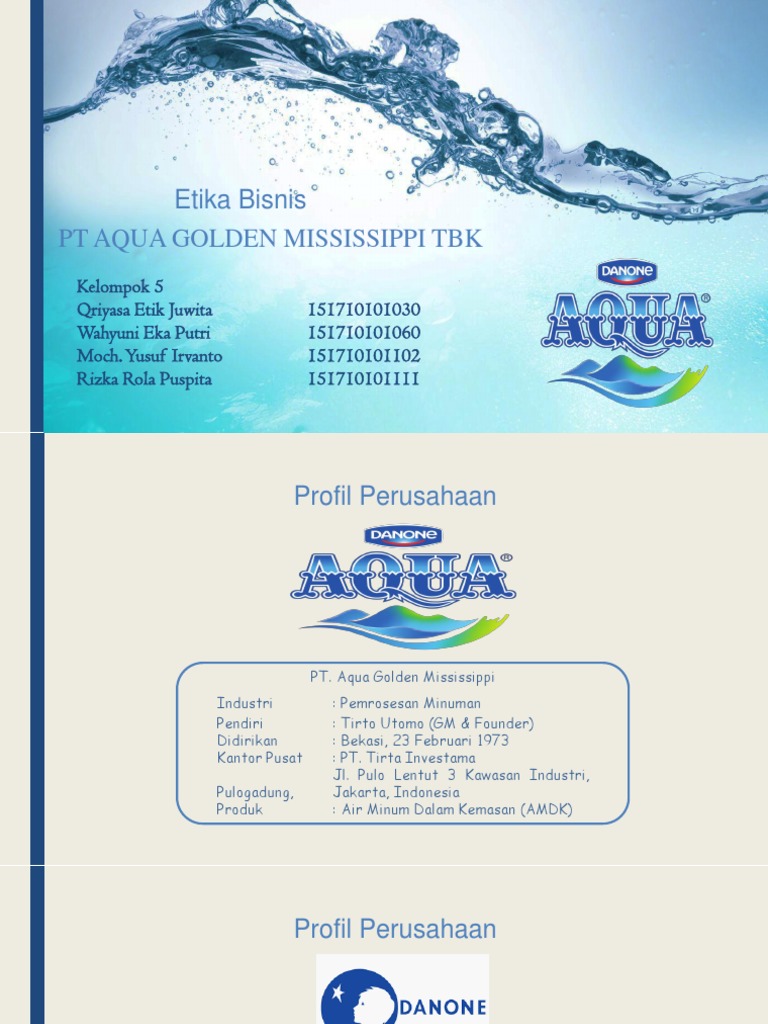 Etika bisnis perusahaan aqua. Menurut saya etika bisnis yang dilakukan oleh aqua sangat tepat maksudnya yaitu program ini tepat pada sasaran dimana aqua membantu masyarakat di ntt yang mengalami. Aqua golden mississippi tbk yang merupakan perusahaan air minum dalam kemasan amdk yang sangat sudah dikenal masyarakat indonesia. Etika bisnis pada pt.