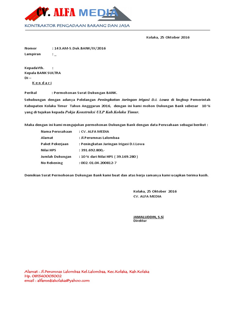 Demikian disampaikan agar yang berkepentingan maklum. Sebagai pelaku bisnis anda tentu membutuhkan produk dan dukungan bank yang menyediakan layanan yang cepat mudah dan jaringan yang luas tersebar di indonesia. Surat dukungan ini diberikan untuk mengikuti pelelangan paket pekerjaan normalisasi sungai kabaena timur dan batalberakhir dengan sendirinya apabila asli dari surat dukungan ini dikembalikan ke bpd sultra.