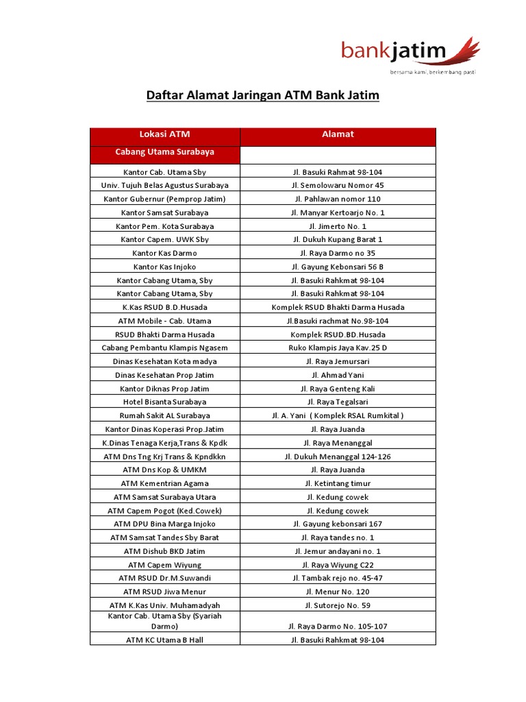 Jaringan atm bank jatim di surabaya info surabaya seperti kita ketahui bersama pada posting sebelumnya admin telah berbagi informasi dan ulasan seputar kantor cabang bank jatim di surabayaselanjutnya pada kesempatan yang berbahagia ini admin akan berbagi info singkat tentang jaringan atm bank jatim yang tersebar di wilayah surabaya. Bank jatim adalah bank terbesar di jawa timur yang terbaik untuk anda. 031 531 0090 99 fax.