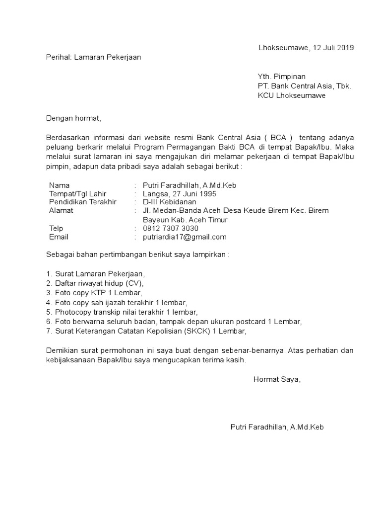 Contoh Surat Lamaran Kerja Di Bank Bca Medan