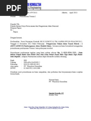 Permohonan tagihan kepada yang terhormat kepala dinas perairan dan irigasi provinsi jawa timur di surabaya sebelumnya perlu kami informasikan bahwa proyek yang kami jalankan berdasarkan. Mojokerto 18 maret 2014 ibrahim sm direktur operasional. Permohonan pencairan dana kepada yth kepala btn mojokerto di tempat dengan hormat untuk proses pencairan dana dapat ditransfer ke rek btn nomer 00059 01 50 016213 9 atas nama ibrahim.