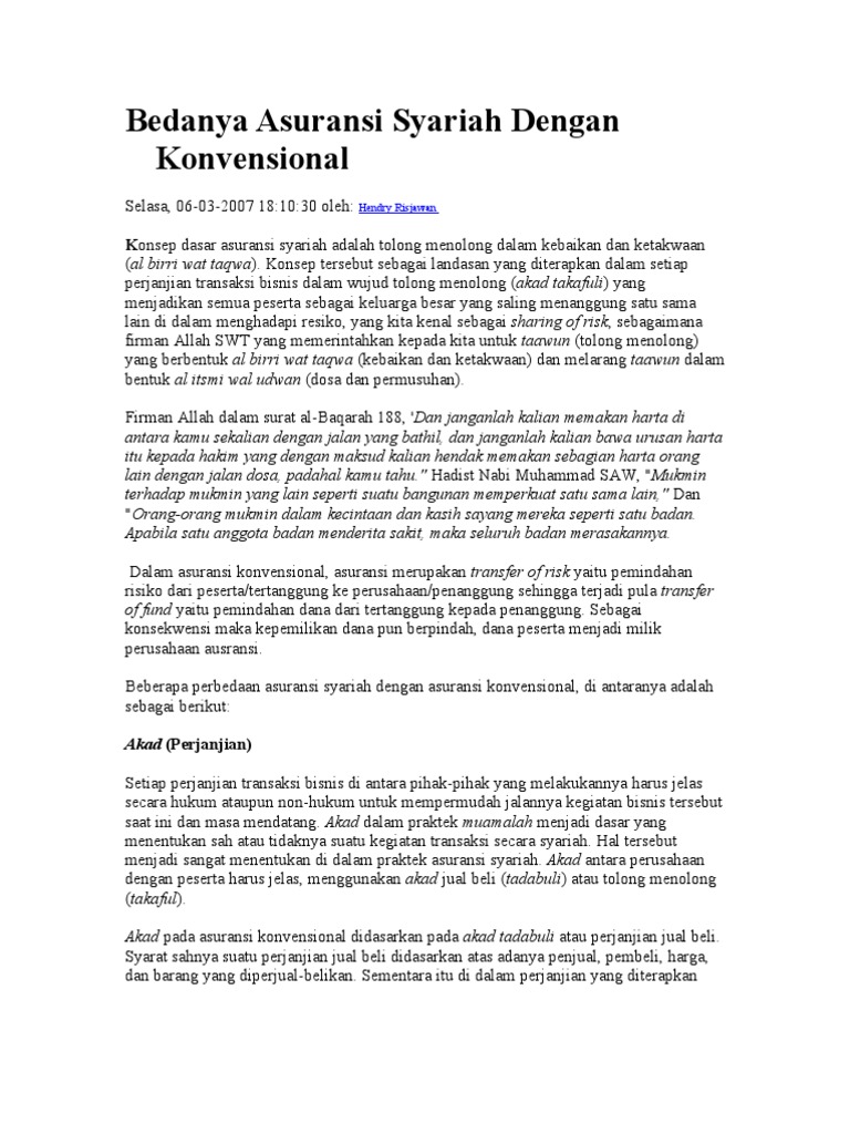 Perbedaan asuransi syariah dan konvensional. Pengelolaan risiko pada dasarnya dalam asuransi syariah sekumpulan orang. Untuk pengaturan asuransi di indonesia dapat dipedomani fatwa dewan syariah nasional no. Perbedaan asuransi syariah dan asuransi konvensional melihat perkembangannya asuransi syariah jauh memiliki banyak keunggulan dan kelebihan jika dibandingkan dengan asuransi konvensional.