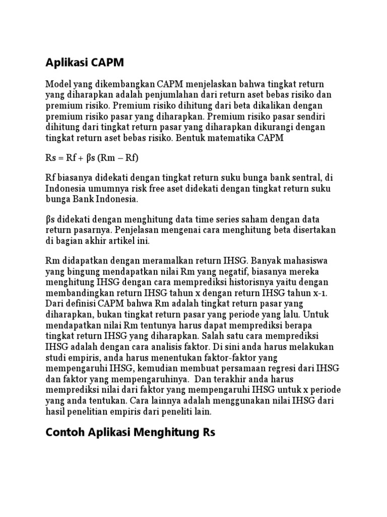 Capital asset pricing model capm mencoba untuk menjelaskan hubungan antara risk dan return. Capm e𝑅 𝑓 𝛽 p 𝐸𝑅 𝑚 e𝑅 𝑓. Penjelasan mengenai cara menghitung beta disertakan di bagian akhir artikel ini.