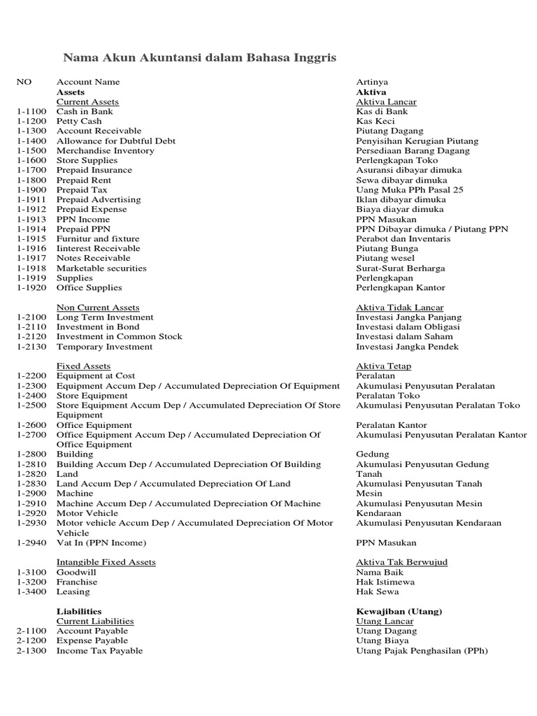 Nama Akun Akuntansi Dalam Bahasa Inggris