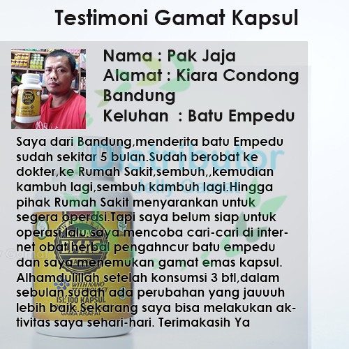 Dengan manfaatnya tersebut obat herbal walatra gamat emas kapsul dijadikan sebagai solusi tepat dalam mencegah serta mengobati berbagai macam penyakit. Tetapi jangan khawatir sekarang telah hadir gamat emas kapsul walatra. Obat walatra gamat emas kapsul ini terjamin mutu dan kualiat terbaik karena terbuat dari 100 ekstrak gamat emas pilihan dan juga sudah bersetifikat asli dan walatra gamat kapsul ini sudah memiliki ijin dari bpom ri kualitasnya tidak di ragukan lagi karena ini adalah hasil uji dan penelitian para ahli herbal terhadap penyakit penyakit.